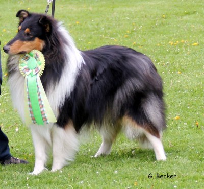 Glen hat heute seine erste Ausstellung hinter sich gebracht . Das Wetter hat gepasst, es war trocken, teilweise hatten wir sogar recht warme Sonne. Er hat sich gut präsentiert und hat einen vorzüglichen Richterbericht bekommen - wir haben tatsächlich ein V4 mit nach Hause genommen Nur das Knutschen der Richterin sollte er noch lassen, dann rutschen wir auf den Plätzen sicher noch etwas nach vorne.
